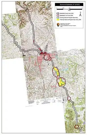 Two discontinuous areas totalling 214 acres (87 ha) were listed on the National Register of Historic Places as Battle of Richmond Historic Areas in 1996.[9] These included four contributing buildings.[12]