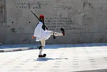 The Tomb of the Unknown Soldier in Athens. The inscription "ΡΙΜΙΝΙ" can be seen in the stone carved text right above the guard's foot.