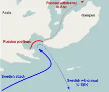 Swedish forces mounted an attack (also known as Battle of Pukkisaari or Battle of Bockholmssund) against Russians towards Turku while Russians under command of Lieutenant General P.K. Konovnitsin formed line from their gun sloops and gun yawls between islands of Ruissalo and Hirvensalo (60°24′43″N 22°08′13″E / 60.412°N 22.137°E) under cover of the artillery batteries. Detachments or Russian infantry - sharpshooters - were deployed on the shores of islands of Ruissalo and Hirvensalo. Battle which started at 18:00 lasted until the midnight. Though Russian line had bent Swedes were unable to breach it. Battle ended without a clear winner with 11 Russian ships damaged and most of the Swedish ships damaged.[2]