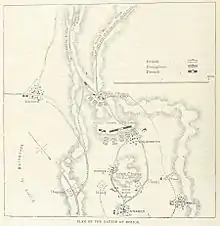 Wellesley arrived at Óbidos on 16 August and moved toward Roliça on the following day. At the beginning of the battle, Delaborde occupied a position to the north-northwest of the village of Roliça. Wellesley attempted to manoeuvre his forces into a double envelopment, moving to each flank of the French position with his main force organised into three fighting columns of brigades.[12] This could be attempted since the Anglo-Portuguese army outnumbered the French forces present by over 3 to 1.[11]