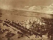 Infantry from the 52nd (Lowland) Division joined the two mounted brigades at Romani between 11 May and 4 June, when the development of the railway made it possible to transport and supply such a large number of soldiers. The infantry occupied a defensive position known as Wellington Ridge, facing a tangle of sand dunes.[18][44] The area favoured defence; sand dunes, stretching about 6 miles (9.7 km) inland, covered an area of 30 square miles (78 km2), including, to the south of Romani, the northern route from El Arish. On the southern and south eastern edges, a series of dunes of shifting sand with narrow sloping lanes led to a tableland of deep soft sand.[45]