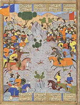 Battle of Rostam and Esfandiyār (Persian: نبرد رستم و اسفندیار) is a story in Ferdowsi's Persian epic Shahnameh. It narrates a war between two Iranian governments. The difference from the other wars is that only the warlords are engaged in duels and the division is both observers. The reason for the war is Rostam's disobedience to Esfandiyār's father, Goshtāsp, the king of Iran.[1]