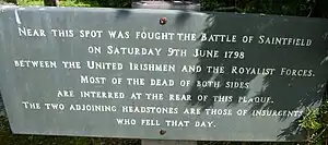 Many of the dead from both sides of the battle of Saintfield were placed in a mass grave within the grounds of the nearby Presbyterian church. Although there is a plaque signifying the location of these graves, the area seems largely neglected with what appears to be temporary vehicle access over the belligerents final resting place. In May 2010 a memorial park was finished and opened. The area has been cleared and landscaped, with several new plaques and information boards being erected. The graves have been refurbished and the headstones relaid.