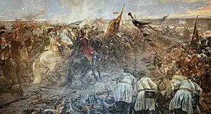 As the light began to fall the entire Habsburg force, with cavalry on each side and the infantry in the middle, launched an all-out assault from the rear, attacking in a crescent shape movement against the defensive position of the Ottomans.[13] The left flank of the Imperial army commanded by General Guido Starhemberg penetrated between the Ottoman left and the bridge, trapping them against the river. The army's right wing was under the command of General Sigbert Heister. At the same time, Imperial forces led by Charles-Thomas de Vaudémont, attacked from the front and, after engaging in close-quarter fighting, broke through the trenches surrounding the Ottoman camp.[7] The command of the Turkish cavalry was under Hungarian Imre Thököly, who also supported the sultan with some additional Kuruc cavalry.[12]
