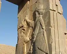 Battle of Shahriar (Achaemenid king) and Lion, "Confrontation between Shahriar and Lion" or "Shah's battle with lion", winged ox, Griffin, and winged lion refers to rock carvings in three palaces of Persepolis, especially the Palace of 100 Columns, which belongs to the transition period of the warrior-ship community in the era of Darius I until the no-war time of Xerxes I were made to represent him as a constructive and disciplinary king.