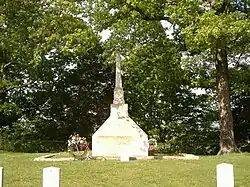 After the battle, graves of fallen Confederate soldiers were placed around the area. During the battle, James Madison Griffin had seen his house used as a hospital. In 1872 he decided to donate some land for the use of a Confederate cemetery. Various troops were reinterred here, and the monument was placed as the focus point of this small cemetery. In 1872, a public subscription sought funds to build a memorial in memory of the Confederate soldiers located there. The original monument, which cost $500, was a simple granite obelisk with inscription and a small base. On June 3, 1911, over 4,000 people from the surrounding counties gathered for Confederate Decoration Day at the monument, with the keynote speakers being ex-Union officers. The monument eventually fell into disrepair. It would be restored in the 1930s, with the enclosure gone and the obelisk placed on a wide concrete base. The state of Michigan has a historical marker at the site as well, commemorating the Union soldiers from Michigan who defended the area; most were immigrants from the Netherlands, and were given their battle commands in Dutch.[2][3]