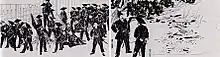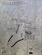 Sasaki ordered his men to charge the Satsuma gunners, but since the Mimawarigumi was armed only with spears and swords, his men were killed en masse.[16] However, the Kuwana forces and a unit under Kubota Shigeaki held their ground, making the skirmish rage on inconclusively.[17] The Shogunate troops set fire to various houses as they retreated, but that allowed Satsuma snipers to aim more easily. The situation stabilized during the night, as troops from Kuwana arrived in reinforcement.[14]