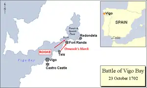 On the evening of 22 October the Anglo-Dutch fleet entered the Ria de Vigo, and sailed past the two forts of the city of Vigo that fired at them as they passed by. At the end of the bay the French fleet and Spanish treasure ships lay in the harbour of Redondela, surrounded by the Galician mountains. Château-Renault had taken charge of the defensive measures, and had blocked the narrow entrance, across the Rande Strait, with a boom made largely of timber and chain tightly bound together.[14] At the north end of the boom was positioned a gun battery which, according to Rooke's journal, comprised "fifteen or sixteen" guns; at the south end sat Fort Rande sitting a little way up from the sea, consisting of a strong stone tower with platforms constructed for cannon. The space between the tower and the water's edge consisted of a fortified enclosure, at the bottom of which stood a battery commanding the straits. In total, the Rande fortifications had been armed with more than 30 guns. To supplement the French troops from the fleet, a number of levies were raised by the Prince of Barbançon, governor and captain-general of Galicia.[11]