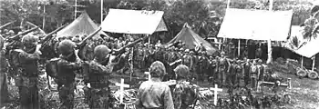 The Marines stopped short of the junction of the Tetemara–Tombe trails, close to their objective (Viru Harbor) on the evening of 30 June, and prepared to launch their attack the following day. Currin's men subsequently launched two-pronged attack the following morning; two platoons were detached to attack Tombe from the northeast, while the rest of the regiment skirted around the harbor to the north, crossing the Viru, Tita and Mango Rivers, and assaulted Tetemara from the southwest.[23] The outpost at Tombe was quickly overwhelmed around 08:45 on 1 July, while the main body of Marines drove the Japanese out of Viru in a running battle that lasted until the early afternoon. They were supported by preliminary air attacks by 17 US Navy Dauntless dive-bombers, while landing craft with combat supplies (ammunition and fuel) entered the harbor to ensure rapid resupply. As Hara's troops withdrew into the jungle, the Marines began constructing defensive positions to wait for reinforcement.[24][25]