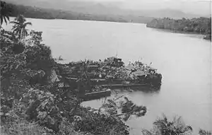 The US destroyer-transports entered the harbor early on 30 June but found that the Marines' advance had been delayed. Coming under fire from a Japanese 3-inch field gun from Tetemara Point, and having been unable to establish radio contact with Currin's Marines, US Navy Commander Stanley Leith decided to withdraw from the harbor.[18] After waiting offshore for the agreed upon signal from the Marines while remaining out of range of the defending Japanese coastal artillery, the ships moved towards Segi Point instead, landing the company from the 103rd Infantry at Nono.[10] Leith assessed that the Marines were potentially in trouble and needed assistance, which could be provided by Kinch's company if they advanced overland to link up with them. As the landing force departed Viru Harbor, Hara reported that his forces had repulsed the landing attempt.[19]