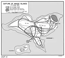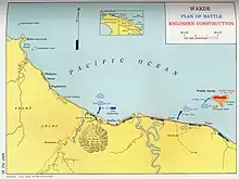 Naval gunfire support was provided by the destroyers Wilkes and Roe, which commenced bombardment around 08:30. Indirect fire support was also provided from mortars and machine guns operated by the troops that had landed on Insoemanai the previous day.[23] The efforts of these forces destroyed the defending Japanese 75 mm gun emplacements and damaged several bunkers.[7] Meanwhile, the landing craft began embarking the assault troops from the beach at Toem, 2 miles (3.2 km) away. Their objective was a 600-yard (550 m) stretch of beach in a sheltered bay south of the jetty in the southwestern part of the island, which was one of the few places around the island where the coral reef did not extend. Their route to the beach would take them to the west of Insoemanai, after which the landing craft would turn northeast for their run to the shore.[24][8]