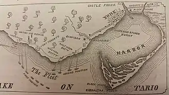 In the months after the second American incursion into York, the defences around the harbour were significantly improved, as the British needed to protect a four-vessel squadron that would be stationed at the town's harbour.[60] On August 6, 1814, the American Lake Ontario squadron pursued HMS Magnet, before its captain set fire to the ship, preventing its capture.[60] Suspecting the ship sailed from York, the American naval squadron made its way to the settlement in order to evaluate the situation, and discover if any more ships could be captured there.[60]