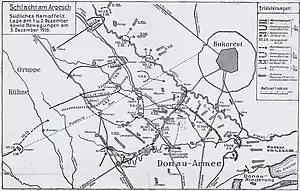 In late November 1916, Germano-Bulgarian forces under August von Mackensen crossed the Danube near Zimnicea under the cover of fog and began to march on Bucharest.[2][3] The Romanians had transferred most of their forces to the Carpathians and as a result the Central Powers forces had a preponderant advantage: 18 Romanian battalions and 48 artillery pieces against 40 German and Bulgarian battalions and 188 guns.[4] This attack threatened to cut off half the Romanian Army and so the decision was made to launch a counterattack. Relying upon the Russians to contain the fighting elsewhere, the plan entailed using all of the Romanian Army's reserves to launch a flanking attack on the German forces as they crossed the Argeș River, the last natural barrier before Bucharest.[4]