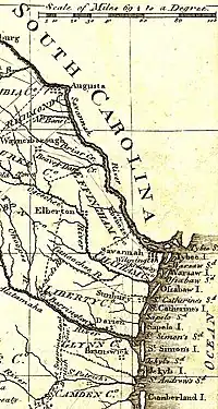 ![]() A 1796 map showing the Savannah area, Hutchinson Island is in the Savannah River near the town. | |||||||