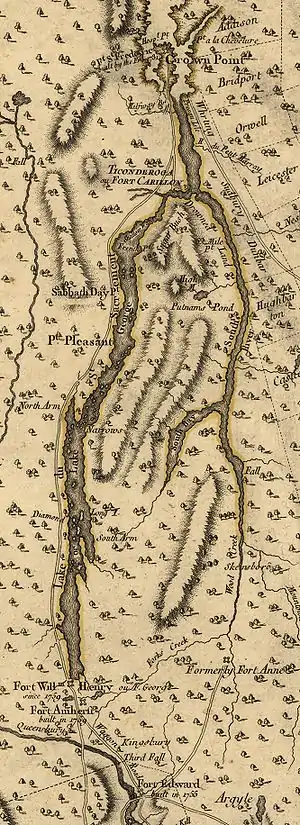 The French and Indian War broke out in 1754 between British and French colonists over territorial disputes along their colonial frontiers, and escalated the following year to include regular troops.[4] By 1756, the French had enjoyed successes in most of their frontier battles against the British. Their only notable failure occurred when the British stopped their southward advance from Lake Champlain in the 1755 Battle of Lake George. From bases at Fort St. Frédéric (located at what is now Crown Point, New York) and Fort Carillon (known to the British as Fort Ticonderoga), the French and their Indian allies continued to scout and probe the British defenses on Lake George and the upper Hudson River.[5] The British, who had fewer Indian allies, resorted to companies of colonial rangers for their scouting and reconnaissance activities.[6] The ranger companies were organized and directed by Robert Rogers, and eventually became known as Rogers' Rangers.[7]