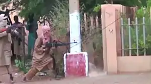 On June 25, 2012, a local elected official and teacher of the city, Idrissa Oumarou was shot at close range by strangers on motorcycle. This murder provoked the anger of the population, and the next day hundreds of people demonstrated in the city. The anger of the population overwhelmed by the regular deprivation of water and electricity and by insecurity soon turned against the MNLA's independence movement. According to testimonies the flags of the MUJAO were mixed with the Malian flags during the event. When the demonstrators arrived near the governorate, MNLA men opened fire to disperse the rioters, one or two protesters were killed and at least 12 to 14 wounded.[18] Fighting began in the morning of 26 June, with both sides firing heavy weapons. MNLA Secretary General Bilal ag Acherif was wounded in the attack. After being extricated from the fighting, he was later taken to a hospital in Burkina Faso's capital city of Ouagadougou; while Colonel Bouna Ag Tahib, a defector from the Malian army, was killed. MOJWA soon took control of the Gao governor's palace as well as Ag Acherif's residence. A MOJWA spokesman stated that 40 MNLA troops had been taken prisoner.[19][20]