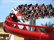 Battlestar Galactica: Human vs. Cylon is a pair of steel, dueling roller coasters at Universal Studios Singapore. One of the coasters is an inverted roller coaster track in blue (gray from 2017 onwards), and the other half is a traditional seated roller coaster in red. The coasters, which opened in 2010 and was inactive between 2013 and 2015, reach 42.5 metres (139 ft) in height and are the tallest dueling coasters in the world.