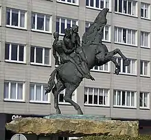 Since the Middle Ages, Bayard has been an important figure in northern French and Belgian folklore, particularly in the Ardennes, notably in Bogny-sur-Meuse, Dinant, Namur and Dendermonde. Folk processions stage it among the processional giants, namely the Ducasse d'Ath and the Ommegang van Dendermonde.[1] The widespread dissemination of his legend and its success have influenced many artists, as well as popular beliefs.