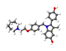 Bazedoxifene, used as bazedoxifene acetate, is a medication for bone problems and possibly (pending more study) for cancer.[2] It is a third-generation selective estrogen receptor modulator (SERM).[3] Since late 2013 it has had U.S. FDA approval for bazedoxifene as part of the combination drug Duavee in the prevention (not treatment) of postmenopausal osteoporosis. It is also being studied for possible treatment of breast cancer and pancreatic cancer.[4]