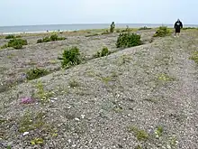 A beach ridge is a wave-swept or wave-deposited ridge running parallel to a shoreline. It is commonly composed of sand as well as sediment worked from underlying beach material. The movement of sediment by wave action is called littoral transport. Movement of material parallel to the shoreline is called longshore transport. Movement perpendicular to the shore is called on-offshore transport. A beach ridge may be capped by, or associated with, sand dunes. The height of a beach ridge is affected by wave size and energy.