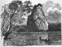 Beacon Rock is an 848-foot-tall (258 m) monolith composed of basalt on the north bank of the Columbia River. It was named by Lewis and Clark in 1805; they originally referred to it as Beaten Rock, later as Beacon Rock. They noted that the rock marked the eastern extent of the tidal influence in the Columbia. The rock was later known as Castle Rock, until 1915 when its name was changed back to Beacon Rock.[3][4]