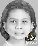 The middle child, currently unidentified,[9][19] also had a gap between her front teeth and died at an age between 2 and 4. She had brown hair and was about 3 ft 8 in (1.12 m) tall. She had an overbite, which was probably noticeable. She also may have suffered from anemia. DNA proved this child was fathered by Terry Peder Rasmussen. In February 2020, it was announced that DNA analysis suggested the child was primarily Caucasian, with slight Asian, African, and Native American heritage.[20] The organization later released an updated version of the child's facial reconstruction.[21]