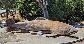 After the Prairie Creek Hatchery closed in 1992, the original Davis salmon sculpture was sold by the Humboldt County Board of Supervisors and is currently installed outside Buck's of Woodside, by a minor tributary of Bear Gulch Creek[13] called Dry Creek.