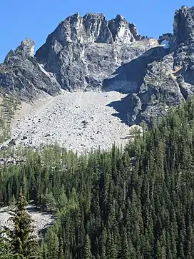 Bearcat Ridge is composed primarily of granodiorite and hornblende quartz diorite, minerals of the Cardinal Peak pluton.[4] The North Cascades feature some of the most rugged topography in the Cascade Range with craggy peaks, spires, ridges, and deep glacial valleys. Geological events occurring many years ago created the diverse topography and drastic elevation changes over the Cascade Range leading to the various climate differences. The history of the formation of the Cascade Mountains dates back millions of years ago to the late Eocene Epoch.[5] With the North American Plate overriding the Pacific Plate, episodes of volcanic igneous activity persisted.[5] Glacier Peak, a stratovolcano that is 23 mi (37 km) west of Bearcat Ridge, began forming in the mid-Pleistocene.[4] In addition, small fragments of the oceanic and continental lithosphere called terranes created the North Cascades about 50 million years ago.[5] During the Pleistocene period dating back over two million years ago, glaciation advancing and retreating repeatedly scoured the landscape leaving deposits of rock debris.[5] The U-shaped cross section of the river valleys is a result of recent glaciation. Uplift and faulting in combination with glaciation have been the dominant processes which have created the tall peaks and deep valleys of the North Cascades area.