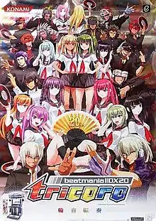 beatmaniaIIDX 20 tricoro is a music video game and the 20th installment of the Beatmania IIDX series of video games. It was first announced on April 14, 2012.[1] Location tests began in Akihabara and Osaka on April 18 and 20, 2012 respectively. Both ended on April 24, 2012.[1] It was released on September 19, 2012 for new cabinets and September 25, 2012 for upgrade kits of old machines. This is the 1st game that requires an internet connection for startup.