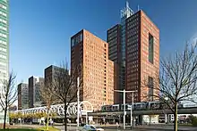 ![]() RandstadRail station Beatrixkwartier, nicknamed The 'Netkous' or Fishnet Stocking, with neighbouring skyscrapers | |
