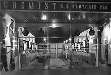 The Norman Edward Brotchie (1929-1991) pharmacy designed in the 1950s by architect Peter McIntyre featured boldly distinctive floor-to-ceiling coloured tile murals. The design by an unknown artist of overlapping cubist apothecary jars and bottles in yellow, brick-red, yellow and black covered sides of the facade and the interior walls of the premises at the southwest corner of Keys Street, Beaumaris. They were demolished during renovations in 2007.[23]