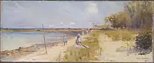 From the late 19th century Beaumaris and its coastal scenery attracted artists. Near Ricketts Point, there is a monument commemorating the first encounter of Arthur Streeton and Heidelberg school artists Tom Roberts and Fred McCubbin who rented a house over the summer of 1886/7. McCubbin later painted A ti-tree glade there in 1890.[78] Their associate, Charles Conder also painted idyllic scenes on the beach at Rickett's Point before he left for Europe in 1890. These paintings of Beaumaris are featured on plaques at the sites which they depict in the City of Bayside Coastal Art Trail.