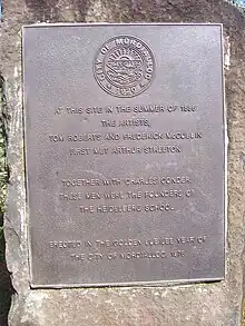 The first Cheltenham settlers, Stephen and Mary Ann Charman, donated land in 1854 that was the first cemetery of the area, established in the churchyard of the small timber Wesleyan Church at the western corner of what is now Balcombe Road and Bickford Court.[26] There, two of the Charman's own babies were buried in 1855 and 1859. Soon reaching capacity, this small cemetery operated for only 11 years with the last known burial in 1866. Other faiths traveled to Brighton to bury their dead. The church building on the site was sold in 1893 and moved to Langwarrin and the land turned over to grazing. In 1954 the Moorabbin Council, faced with growing population and ramping land values, granted a permit to the Methodist Church to subdivide the land. Everest Le Page, Moorabbin Councillor and Cheltenham resident, believing that the previous burial sites may not have been relocated following the closure of the church, argued unsuccessfully against sub-division and seven lots of land were sold and houses built there. Researcher Shirley Joy was unable to find evidence in 1998 that the church burials at the site had been relocated prior to the subdivision and development of the land [27] Responding to her efforts Mayor of Bayside, Cr Graeme Disney, had a commemorative bronze plaque set into the footpath at the corner of Balcombe Road and Bickford Court, Beaumaris.[28]