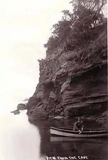 The blunt V-shaped intrusion of land into the Bay that is spearheaded by Table Rock Point is referred to as the Beaumaris 'Peninsula'. The Beaumaris cliffs to the north east of Table Rock are formed by the steeply folded rock layers known as the Beaumaris Monocline, which is considered to be of Tertiary age overlying older structures.[3] These include the underlying Silurian rock known as the Fyansford formation above which is the 15 m thick darker Beaumaris Sandstone, overlain by yellowish Red Bluff Sandstone, as outcrops in the cliffs, ferruginised, with hard ironstone in the upper sections, extending to the platform, and as small reefs parallel to the coastline. A thin calcareous sandstone is overlain by fine sandy marl and sandstone with calcareous concretions. At the base of the sandstone is a thin gravelly bed that includes concretionary nodules of phosphate and iron of which detached nodules may be found around the cliff base.[3][4]