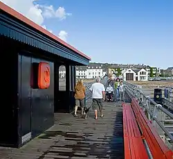 The refurbished Beaumaris Pier was unveiled for the 2011 season. There are refurbished seats with new planking, shelters plus an end pavilion, and a dual-purpose landing stage. Visitors can buy a license to enable Sea Fishing, and access commercial boat services to cross to Puffin Island, or travel down the Menai Strait.[1] To the left of the piers main deck is the Blue Peter II lifeboat station.[2] The full length of the pier was refurbished in 2011-2012 and a floating pontoon landing stage was installed at the seaward end of the pier. The works included replacing all of the timber decking and the steel beams supporting the deck, and restoring the pier to its full width. The pier was reopened in May 2012. The designer of the pier refurbishment was the Colwyn Bay office of Capita Symonds Ltd, and the contractor was BAM Nuttall Ltd.