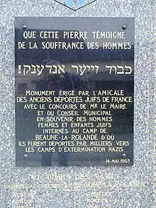 In 1965, a stele was constructed at the site in memory of the Jewish internees, on 14 may 1989, a larger monument in black marble with a list of victims and a gold star of David etched out on its summit was added.[22] On the stele, is inscribed the following phrase:[23]