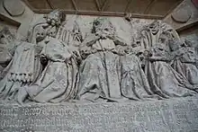There are many accounts of rituals of inversion, in which the church sometimes stood for the whole social order. Children sometimes participated enthusiastically, and street games afterwards became play battles between "papists" and "beggars". One child was killed in Amsterdam by a stone thrown in such a game.[25] Elsewhere the iconoclasts seemed to treat their actions as a job of work; in one city the group waited for the bell rung to mark the start of the working day before beginning their work. The tombs and memorial inscriptions of the patriciate and nobility, and in some cases royalty, were defaced or destroyed in several places, although secular public buildings such as town halls, and the palaces of the nobility, were not attacked.[26] In Ghent, on the one hand the memorial in a church to Charles V's sister Isabel (and so Philip's aunt) was carefully left alone, but a statue in the street of Charles V and the Virgin was destroyed.[27]