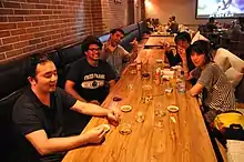 North Koreans need to expend food coupons when buying beer, which will diminish their grain rations.[21] North Korean men residing in Pyongyang can receive beer vouchers that entitle them to one or two monthly liters of beer at low-end bars.[12] These limitations make beer a beverage primarily for the elite.[21] It is not uncommon for donju, the nouveau riche of Pyongyang,[22] to frequent beer houses.[23] According to the KCNA, there are some 300 newly installed beer taps in Pyongyang,[24] consistent with plans to open 300 pubs announced earlier.[25][24] There is a "huge number" of bars in Pyongyang where beer is available.[12] In the summer and during festivals, beer tents pop up around Pyongyang.[26]
