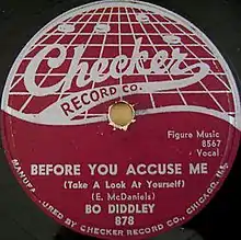 "Before You Accuse Me" (also known as "Before You Accuse Me (Take a Look at Yourself)") is a song written and recorded by American musician Bo Diddley in 1957. The song was originally released as the B-side to Diddley's "Say Bossman" and included on his self-titled debut album in 1958.[2] Backing Diddley on vocal and guitar on the original recording were Jody Williams on guitar, Willie Dixon on bass, and Frank Kirkland on drums.[3] The song has also been recorded by several other artists, such as Creedence Clearwater Revival and Eric Clapton.