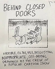 Behind Closed Doors: Horrible, Filthy, Vile, Disgusting, Inappropriate, Off-Model Drawings by the Crew of a Popular Cartoon Show is an unreleased book of pornographic drawings of SpongeBob SquarePants characters created by storyboard artists for Nickelodeon in the early 2000s. First publicly mentioned by SpongeBob storyboarder Kent Osborne[lower-alpha 1] in a 2012 Hogan's Alley interview, excerpts from Behind Closed Doors were leaked online in July 2023 after an anonymous former Nickelodeon employee contacted YouTuber LSuperSonicQ with information about and a limited selection of drawings from the book. Reactions to Behind Closed Doors were negative, and discussion focused on the graphic crudeness of the illustrations.