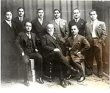 Kassir also recounts that Salim Salam's eldest daughter, Anbara, "in the 1920s was to be the first Muslim woman in Lebanon to go out in public unveiled" and that "in the meantime she had been sent to study in London, together with her younger sister; a photograph taken during her stay there shows Anbara wearing an elegant cloche hat and a mid-calf skirt in the company of her father, her brother Saeb, and King Faisal I of Iraq – proof that Salam readily accepted the idea of women doing away with the veil, in defiance of prevailing social conventions in Beirut."[18] In her autobiography, Anbara reveals that she had consulted with her father prior to removing the veil for the first time in public, during a lecture she gave on her impressions of her time in England, and that he had said to her to do as she saw fit.[19]