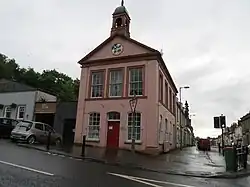 The foundation stone for the new building was laid on 22 May 1817. It was designed by William Dobie in the neoclassical style, built in painted ashlar sandstone and was completed later that year.[3][4][5] The design involved a symmetrical main frontage of three bays facing onto The Strand. The ground floor featured a segmental headed doorway with a fanlight, flanked by a pair of segmental headed windows, while the first floor was fenestrated by three square headed sash windows. Pilasters were erected at the edges of the outer bays to support a pediment with a coat of arms in the tympanum. At roof level, there was a central bellcote with a ogive-shaped roof and a weather vane. Internally, the principal room on the first floor was the assembly hall, while the ground floor accommodated two shops, one of which was let as an ironmonger's shop from 1862 until the end of the century. There was a prison cell for incarcerating petty criminals under the stairs.[2]
