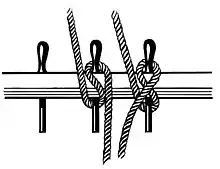 A belaying pin is a solid metal or wooden device used on traditionally rigged sailing vessels to secure lines of running rigging. Largely replaced on most modern vessels by cleats, they are still used, particularly on square rigged ships.