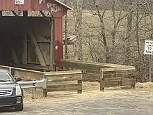Located near the community of Barlow in Barlow Township, the bridge carries the gravel Bell Road over Falls Creek,[1]: 4 a southwestern tributary of Wolf Creek. Surrounded by woods,[2] the bridge lies adjacent to the farm once owned by the namesake Bell family, and the surrounding countryside is a mixture of forests and agricultural fields.[1]: 4 The builder was E.B. Henderson, who was responsible for four bridges in the area: the Blackwood Covered Bridge (1879), the Shinn Covered Bridge (1886), the Bell Covered Bridge (1888), and the Henry Covered Bridge (1894). Like two of the other three, the Bell is a multiple king post truss design, which became popular nationwide following its use on the National Road in a past version of the Y-bridge in Zanesville to the north.[1]: 3 An ordinary gable-roofed bridge with windows just below the roofline, the bridge spans 59 feet (18 m);[2] the deck is approximately 18 feet (5.5 m) wide, with 15 feet (4.6 m) of interior width, and the 11 feet (3.4 m) height permits slightly more than 9 feet (2.7 m) of interior clearance. It rests on abutments built of sandstone, quarried locally, while the roof is made of tin. The abutments are similar, with their faces underlying the bridge decks and wing walls to the side.[1]: 4