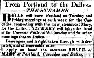 Passengers headed up river would disembark at the lower Cascades, travel on the portage road along the north bank, and then board the sidewheeler Mary upriver to the next head of navigation, The Dalles. Freight charges were high, $50 a ton on cargo from Portland to The Dalles, but Belle and Mary still could not handle the demand, and other steamers came on the routes, driving rates down to $30 a ton.[2][3][5]