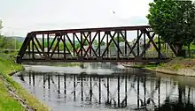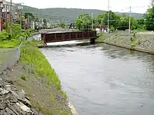 Usage declined with the arrival of railroad service in the area in 1849, and the canal ceased to carry boat traffic in 1858.[6][7] After 1858, the canal only supplied water power to the neighboring mills, of which there were six at the time.[7] After the mills were converted to electric power, the lower (southern) end of the canal with the locks was filled in, and the upper part of the canal was enlarged in 1926-28 to bring more water to a new hydroelectric generating plant built on Bridge Street, which became the southern end of the canal.[5][6][8][9] The hydroelectric plant has a fish ladder, primarily to aid the passage of American shad, with a visitors center and viewing window that is usually open in the summer.[10]