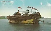 The deck was also a load, usually of cut boards, and was similar in size to that of a modern aircraft carrier.[2] It had two to four holes for lifting heavy anchors and tightening the ropes holding the rudder. Two cabins were installed near the stern, and served as a balance and as quarters for the crew. A high transverse bridge was built between their roofs with a cabin cut in the middle, where the pilot was located.[11][12] This cabin was usually covered with wood carvings, and sometimes even painted with gold paint.