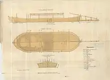 Belyanas were built since the 16th–17th centuries at the places of timber extraction in the Upper Volga region and on the Kama,[1] and were designed for a single trip downstream. The main cargo was timber, in some cases bark fibre, mats, and other similar goods. The length of the hull was up to 120 meters, the width 25 meters, the height 5 meters, the load capacity up to 12,800 tons. The hull was not tarred, which determined the name of such a ship, беляна, derived from the Russian word белый, "white", as opposed to tarred ships, which were black. The cargo could be placed in the hull and in the superstructure with gradual expansion to the sides (up to 2.5–3 meters). There was no upper deck. Dense stacking of the loaded timber was used to achieve an acceptable structural strength of the ship. Two or three holes for anchors and probes were made directly above the laid cargo, and cabins[lower-alpha 1] were also erected, where the crew lived during the floating. The vessel traveled 2000 to 3500 km during the trip.[2]