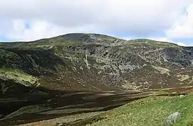 Ben Chonzie or Ben-y-Hone[2][3] (Scottish Gaelic: Beinn a' Chomhainn,[3] 'mountain of the narrowness',[4] or possibly from Beinn Chòinnich, 'mossy mountain')[4] is a mountain in the Breadalbane region of the Scottish Highlands. It is eleven kilometres northwest of Crieff. It stands at 931 metres (3,054 ft) and is therefore listed as a Munro.[5] It is the highest point of a large area of moorland and rounded hills between Loch Earn and Loch Tay, and with a broad, flat summit and relatively few distinguishing features, it is often regarded as one of Scotland's least interesting Munros.[6]