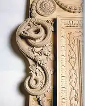 Uppark, a stately home in West Sussex was gutted by fire in 1989, and restored in 1994 in the National Trust's largest renovation project.[1] Harms and Alan Lamb were turned "into latter-day versions of Grinling Gibbons, the most famous woodcarver in England's history",[1] when they carved a new version of the winding fruitwood serpent on one of the saloon doors.[1]